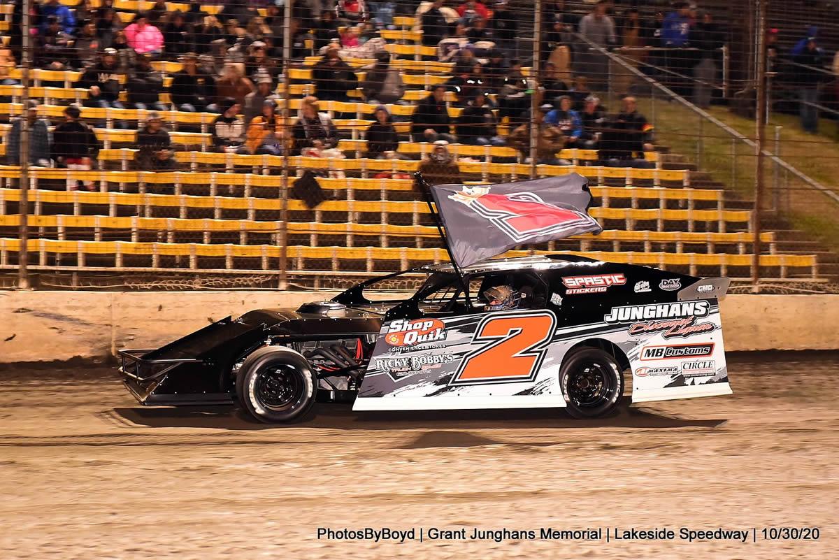 Chase Junghans made the short trip to Lakeside Speedway (Kansas City, Kan.) on Friday night to pilot Jake O’Neil’s secondary ride for the fifth annual Grant Junghans Memorial. Passing four cars in his heat race to finish second behind Jordan Grabouski, Junghans locked into the fifth-starting position for the A-Main. With $10,102 on the line, Chase was an early retiree from the 42-lapper on lap 13. (Todd Boyd photo)