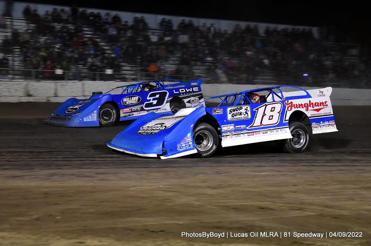 Taking part in the Lucas Oil Midwest LateModel Racing Association (MLRA) season opener, Chase Junghans visited 81 Speedway (Park City, Kan.) on Friday afternoon for the two-day Heartland Hustle. With 39 cars entered, Junghans secured his spot into the opening night feature with the fourth-and-final transfer spot in his heat. With $3,000 on the line, Chase passed 10 cars in the 30-lapper to register a third-place finish. He trailed Bobby Pierce and Ryan Gustin to the checkers. (Todd Boyd photo)